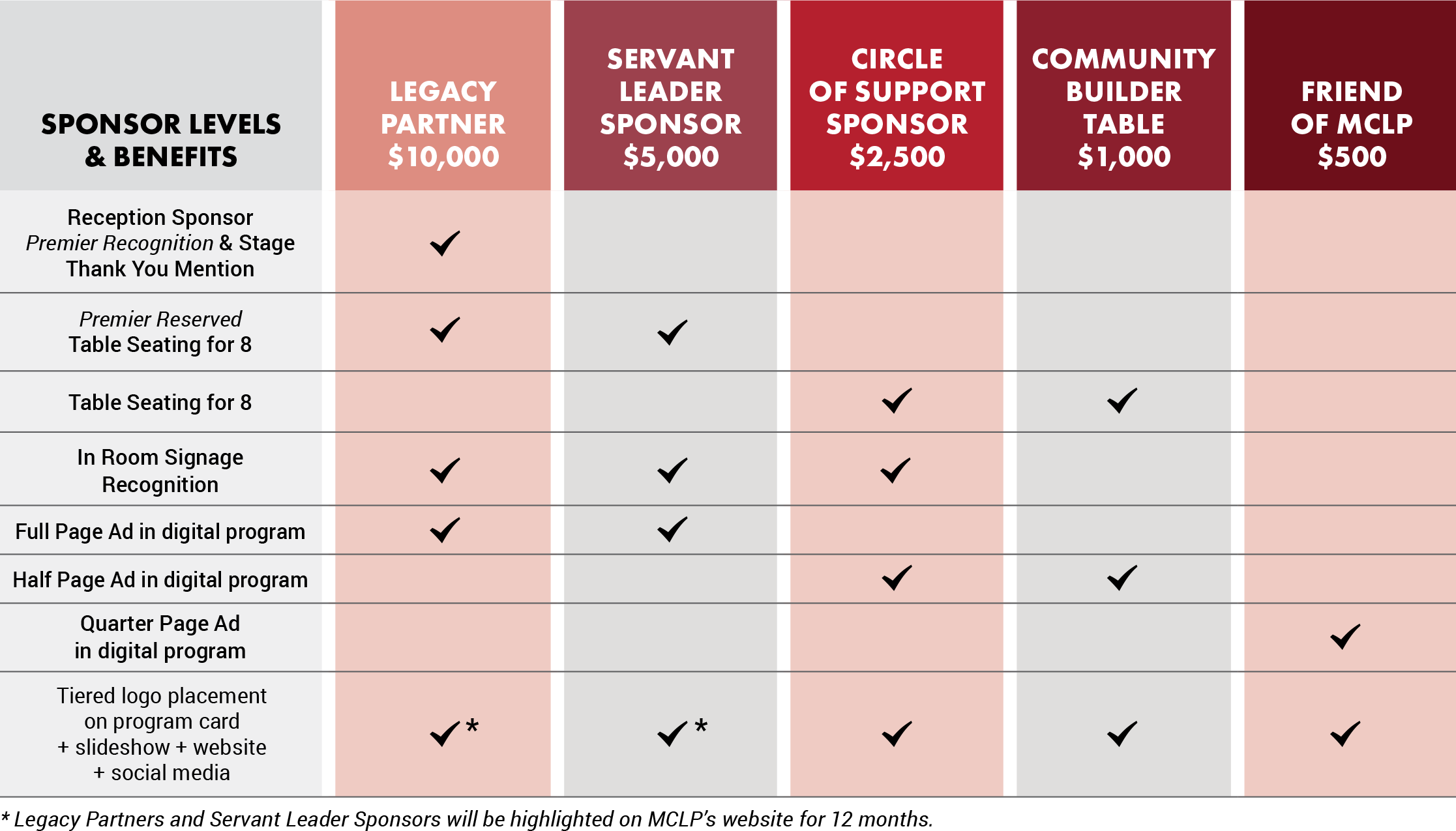 Includes: Premier reserved seating/table (8), premier logo placement, in room signage recognition, full page ad in digital program, logo on program card + slideshow + website + social media. *Servant Leader Sponsors will be highlighted on MCLP’s website for 12 months.